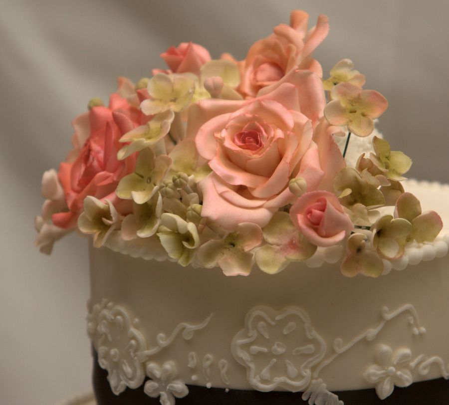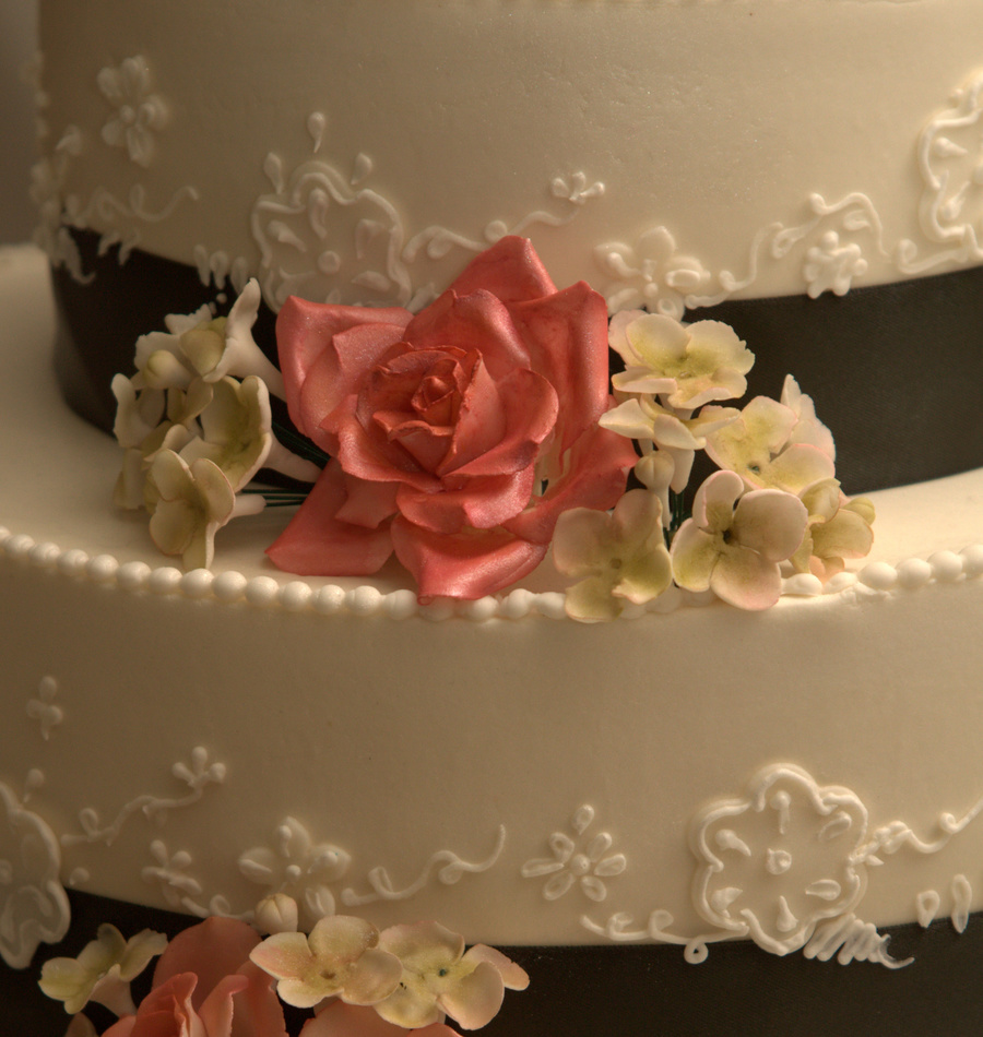 White Almond Sour Cream ~ White almond sour cream cake filled with cream cheese & raspberry filling. Frosted in almond buttercream, decorated with fondant cut-out flowers and RI scrolls. Roses and Hydrangeas made of gumpaste/fondant and hand painted. slik ribbon.