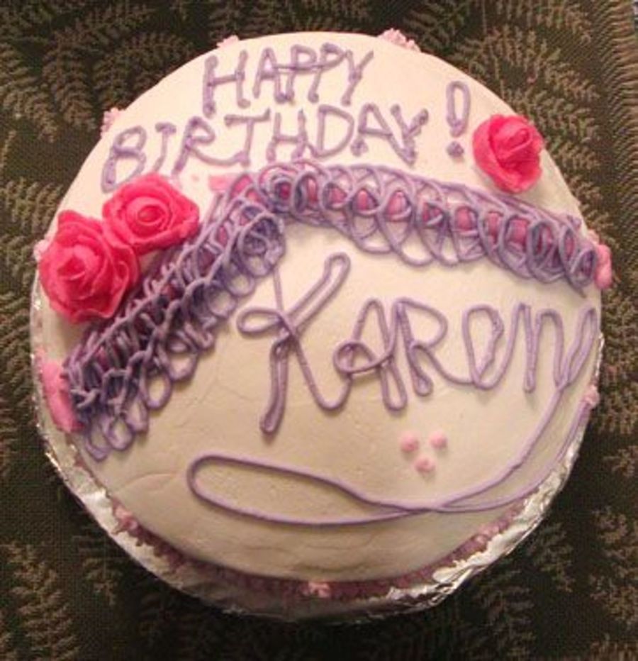 Birthday cake for a fellow student in my knitting class, to be shared with the class. The writing (name) is supposed to be yarn looping off the pink knitting needles above. Roses on top and drop flowers, dots, and shell border adorn the sides.