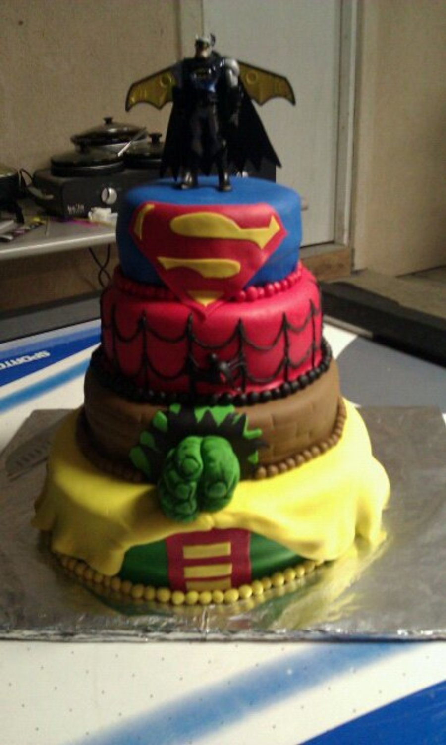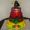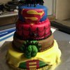 super man, spider man, hulk, robin, and batman toy as toper.... this cake was a big hit at the party. Cake was (2) red velvet cake with cream cheese filing.... and (2) vanilla cake with buttercream and fresh peaches