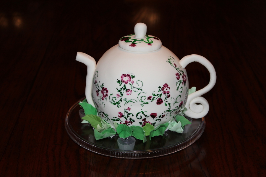 Tea Pot cake made from ball pan with fondant spout, handle & top. Pattern rubber stamped onto pot with food coloring.