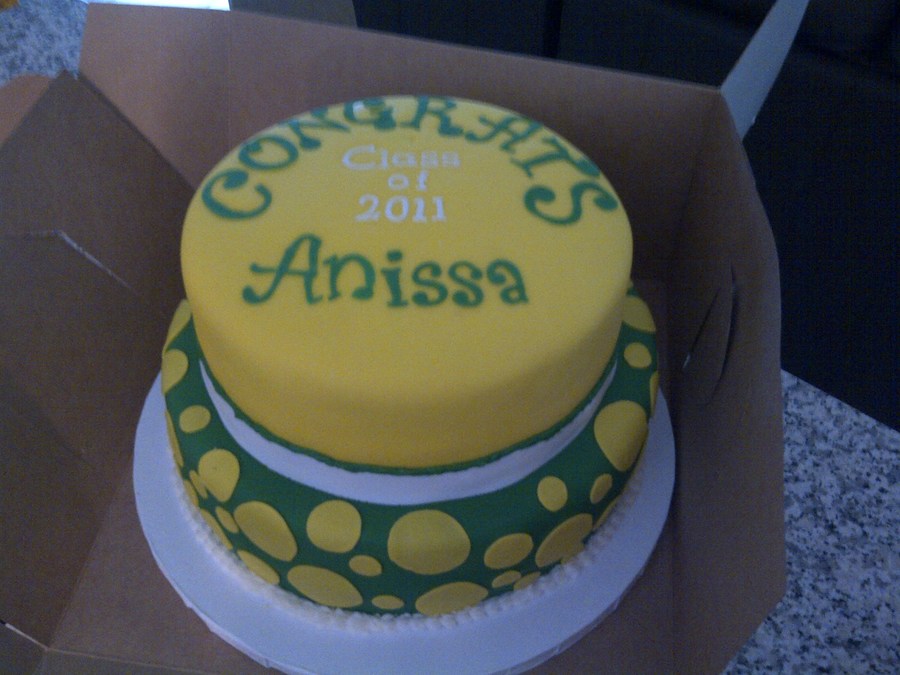 A quick cake for a friend. Her school colors were green and yellow so I did my best to make them work together. It was a 10" chocolate cake and 8" yellow.