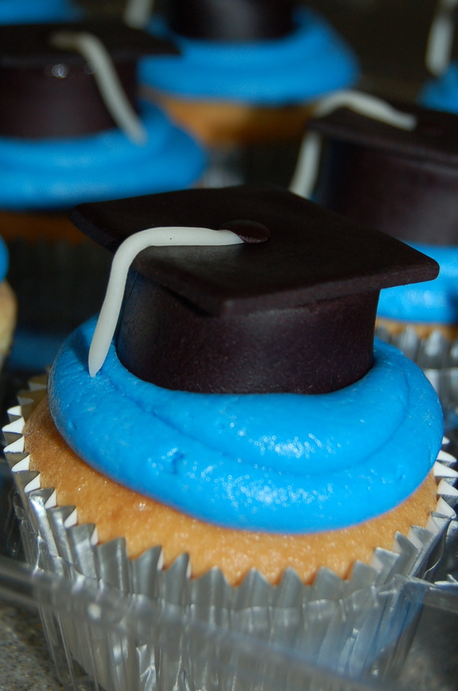 For 6th Grade Graduation at my daughter's school. Cupcakes are WASC iced in blue tinted buttercream and topped with a fondant cap.