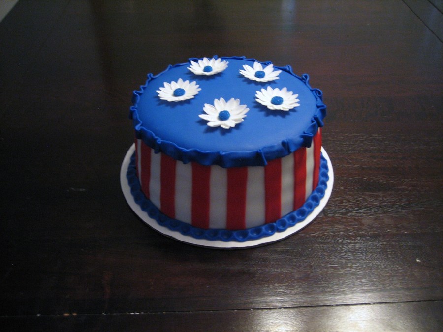 8" round chocolate cake with caramel filling. Fondant stripes and borders. Gum Paste daisies.