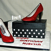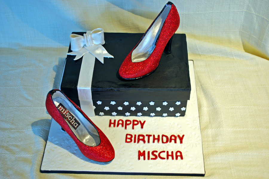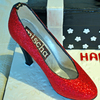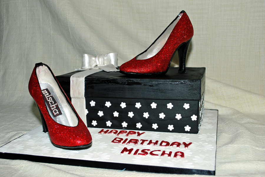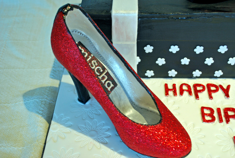 To make shoes i used 3d high heel chocolate mould ... place sugar paste (thick about 2mm) into each mold and cut all excess sugar paste to get half of shoe, press everywhere to get shape. Also, i filled the heel completely with sugar paste to get that stronger and i added one toothpick too. When is completely dry stick them together with THICK royal icing. I used Wilton red edible glitter ... cover whole shoe (no heel) with flower glue then pure red glitter, heel is painted with black colour and alcohol. When painting is dry cover whole shoe from outside (red and black part) with clear glaze too. That's how i made this shoes...they both left ones, that is reason why i couldn't put them next to each other on top of my cake. Mould i used is just for left shoe...:)