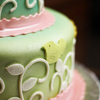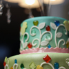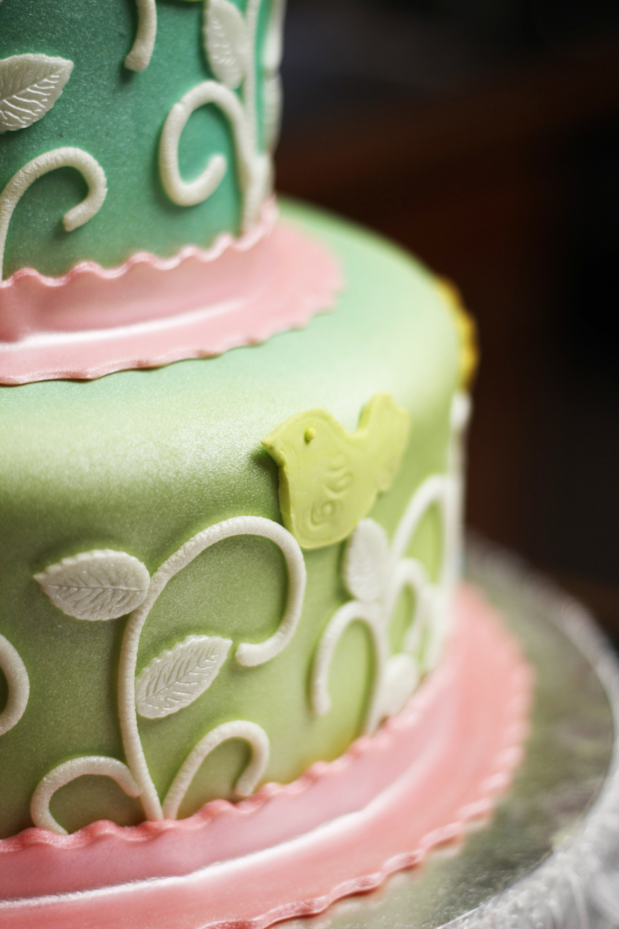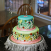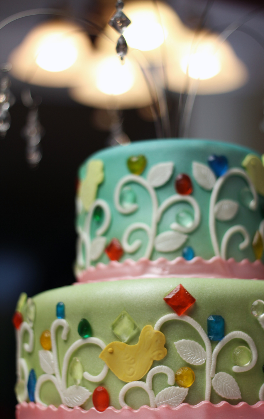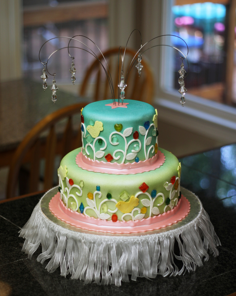 This cake was made for a little girl nick-named "Sparkles", so it *had* to be shiny! Design was inspired by the birthday girl's invitations. Airbrushed in green, blue, and pearlized. Gems are poured isomalt.