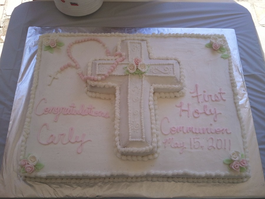 2 full sheets with cross cake on top in BC. Rosary is Gumpaste/Fondant.