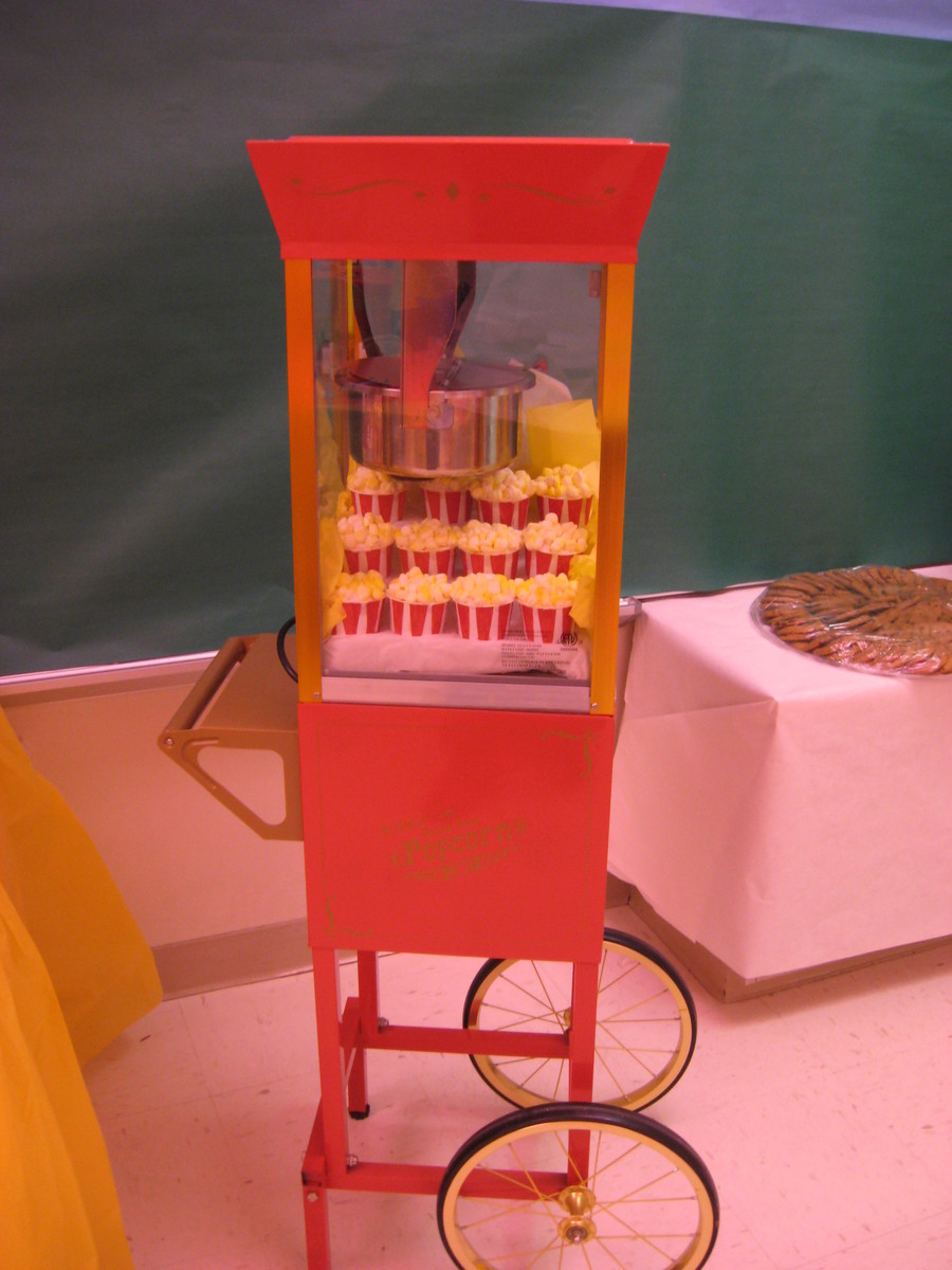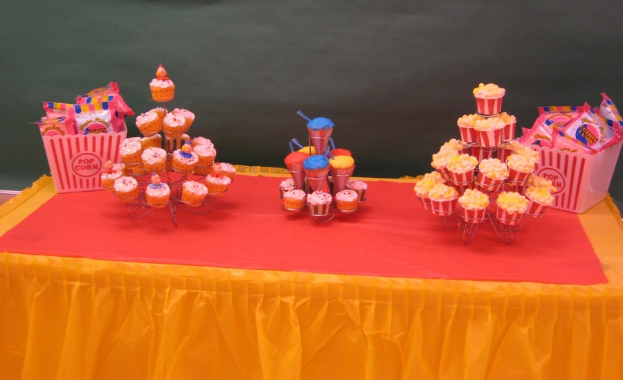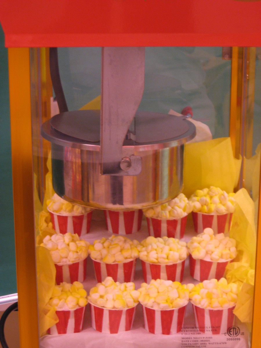 Popcorn cupcakes for a Carnival theme teacher lunch at my son's elementary school. I used the popcorn machine as a display. Also made snowcone cupcakes and cupcakes with clown heads. Thanks for looking.