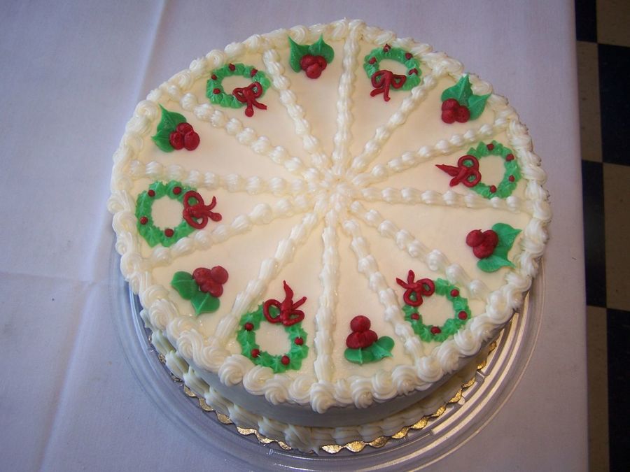 Divided into pieces and decorated with holly leaves and wreaths. This cake is red velvet with vanilla buttercream