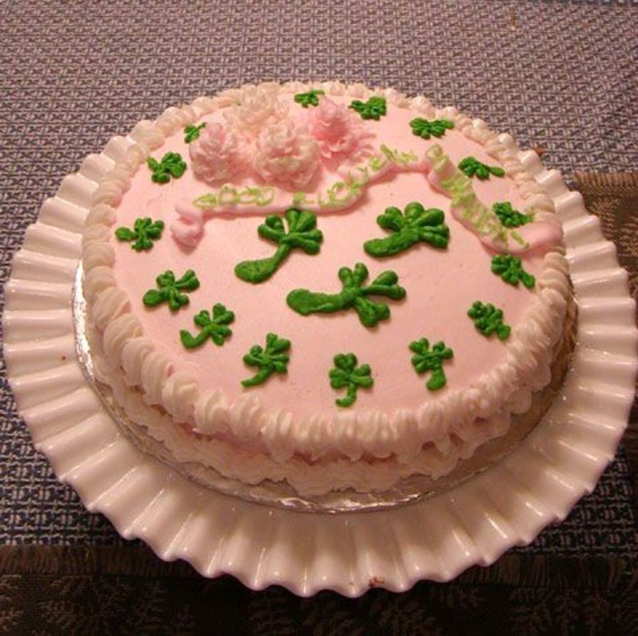 The ribbon says "Good Luck + Erin Go Braugh!". Chrysanthemum flowers and shamrocks from buttercream. Crown shell edge and reverse shell border on the bottom.