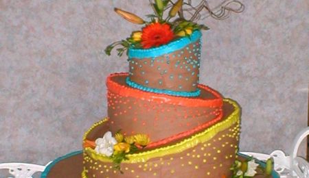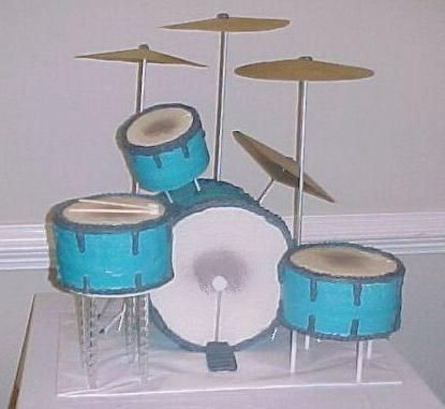 The groom played the drums in their church band and was delighted with the surprise cake. The 2 in the foreground are acturally cake, the rest are a combination of styrofoam and card stock.