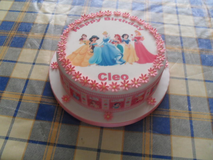 This is a sponge cake covered with fondant then decorated with edible prints and finished off with some small flowers that i made.