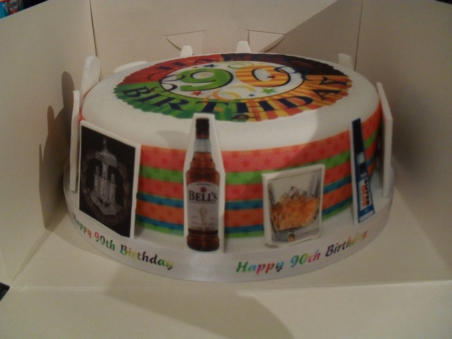 I made this cake was made for my friends grandfathers 90th...Sponge cake covered with fondant and decorated with edible prints. He loved it.