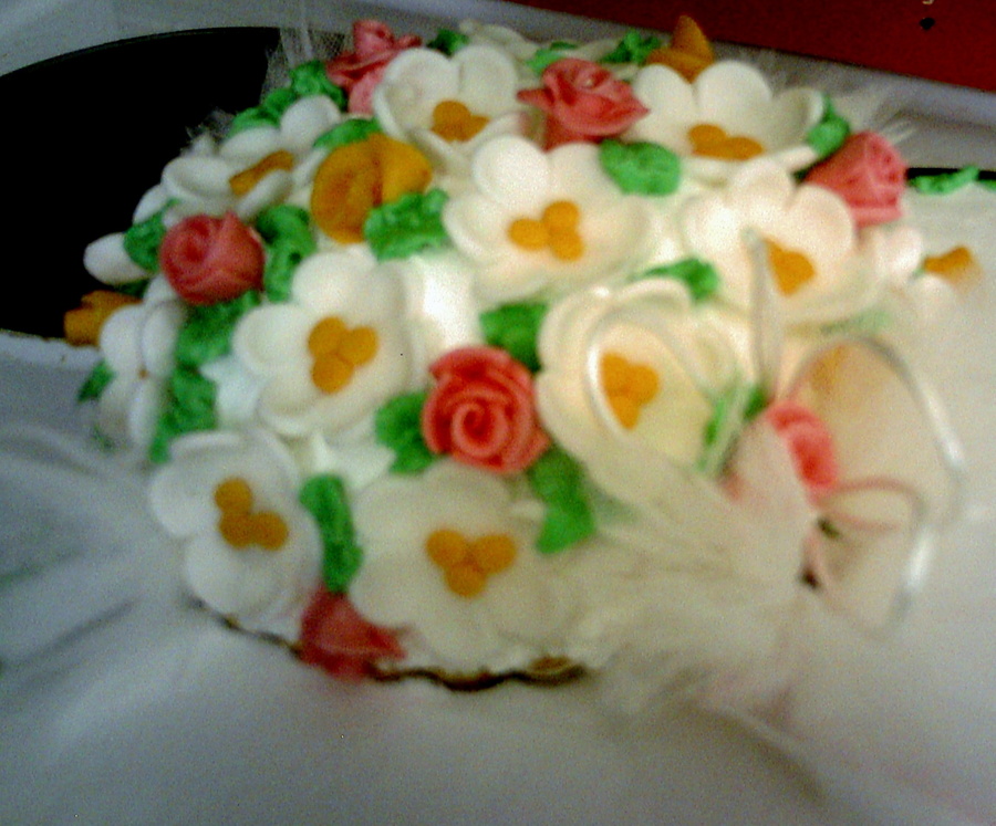 This cake was made to look like her wedding bouquet. this is me learning to make flower. was not spot on but they were very gracious any way.