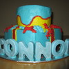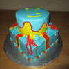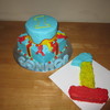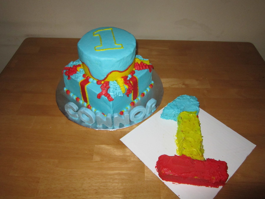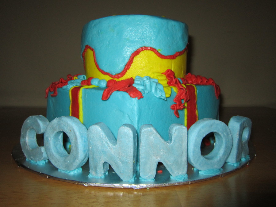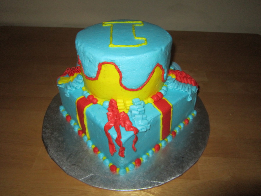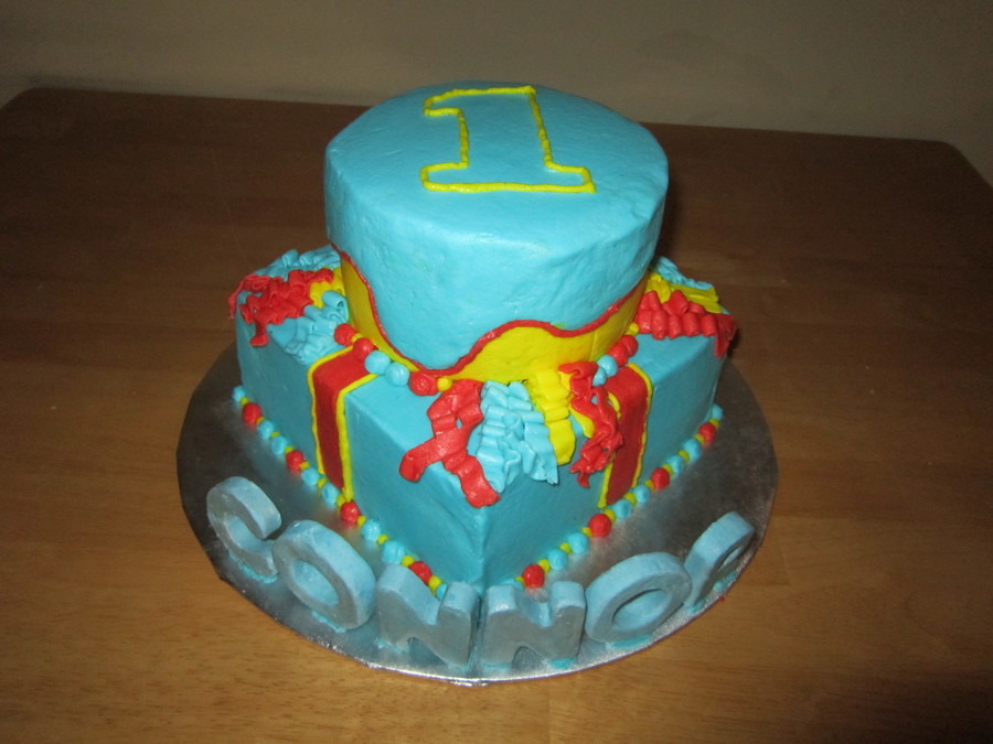 I made this cake for my son's first birthday. This is not my original design, I found it on a google search. I used all butter cream (the original used fondant). It's a 8" square and 6" round both lemon cake. Thanks for looking!