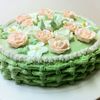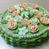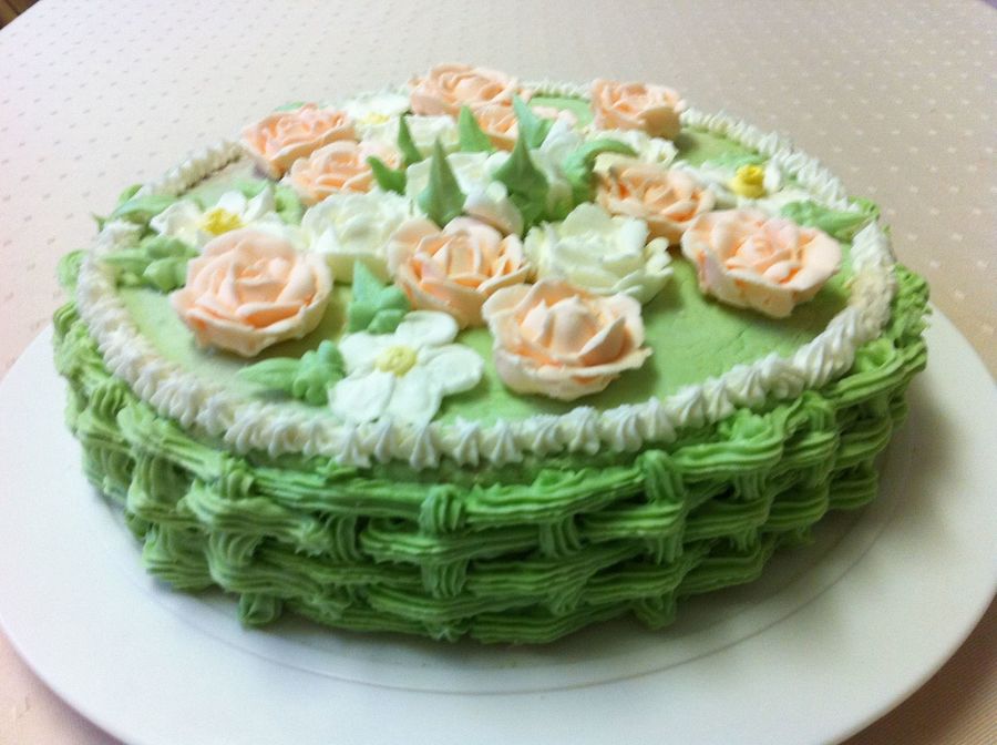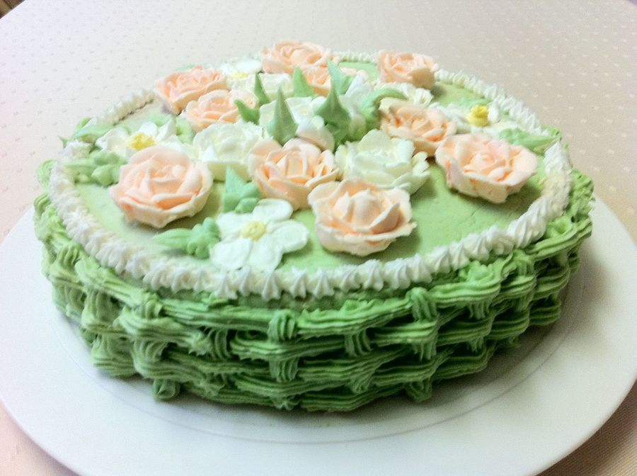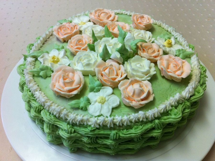 Home made butter cake covered and decorated with butter cream icing and Royal icing flowers.