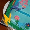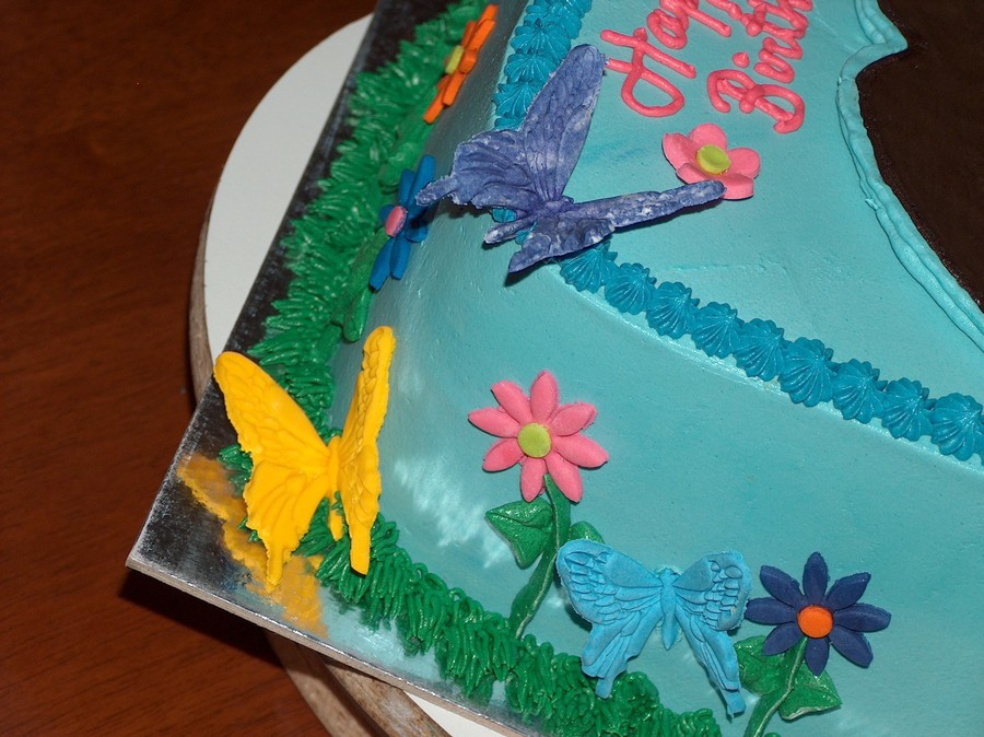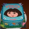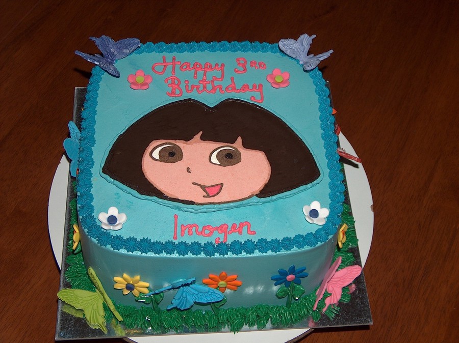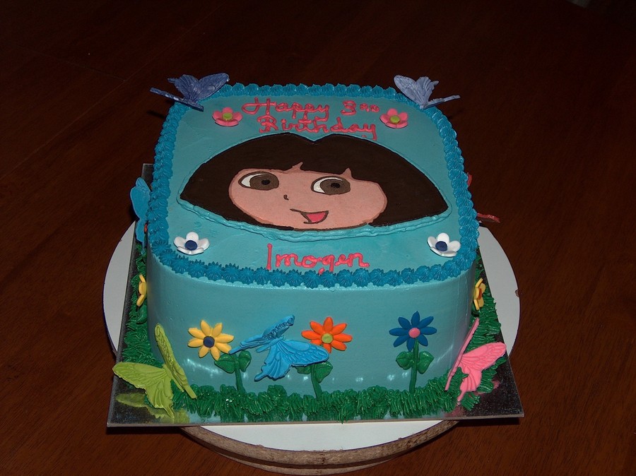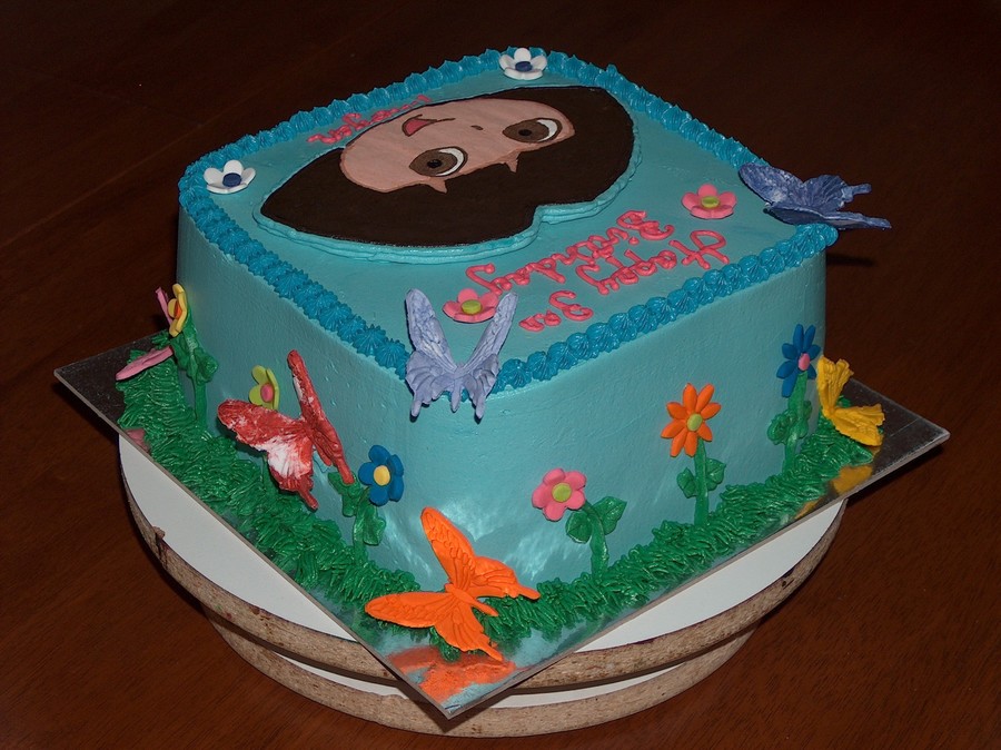 Chocolate cake filled and frosted in buttercream, Dora is a FBCT. Butterflies and flowers are mexican paste.
