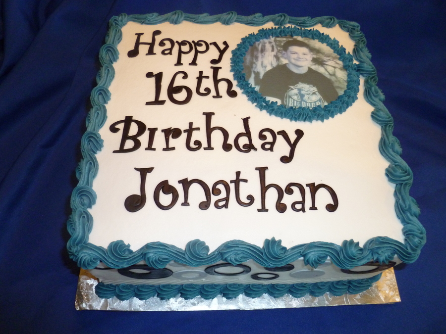 This was a 10" square chocolate with buttercream and fondant accents.. picture is edible image. Also imprinted a slant stripe bottom border.. fun cake to make..