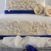 A white fondant cake with gold gumpaste appliques and flowers. Blue satin ribbon to match party theme. Appliques were done with the new Wilton Baroque silicone mold. First time using that. It works awesome!!! Was a really fun cake to do!