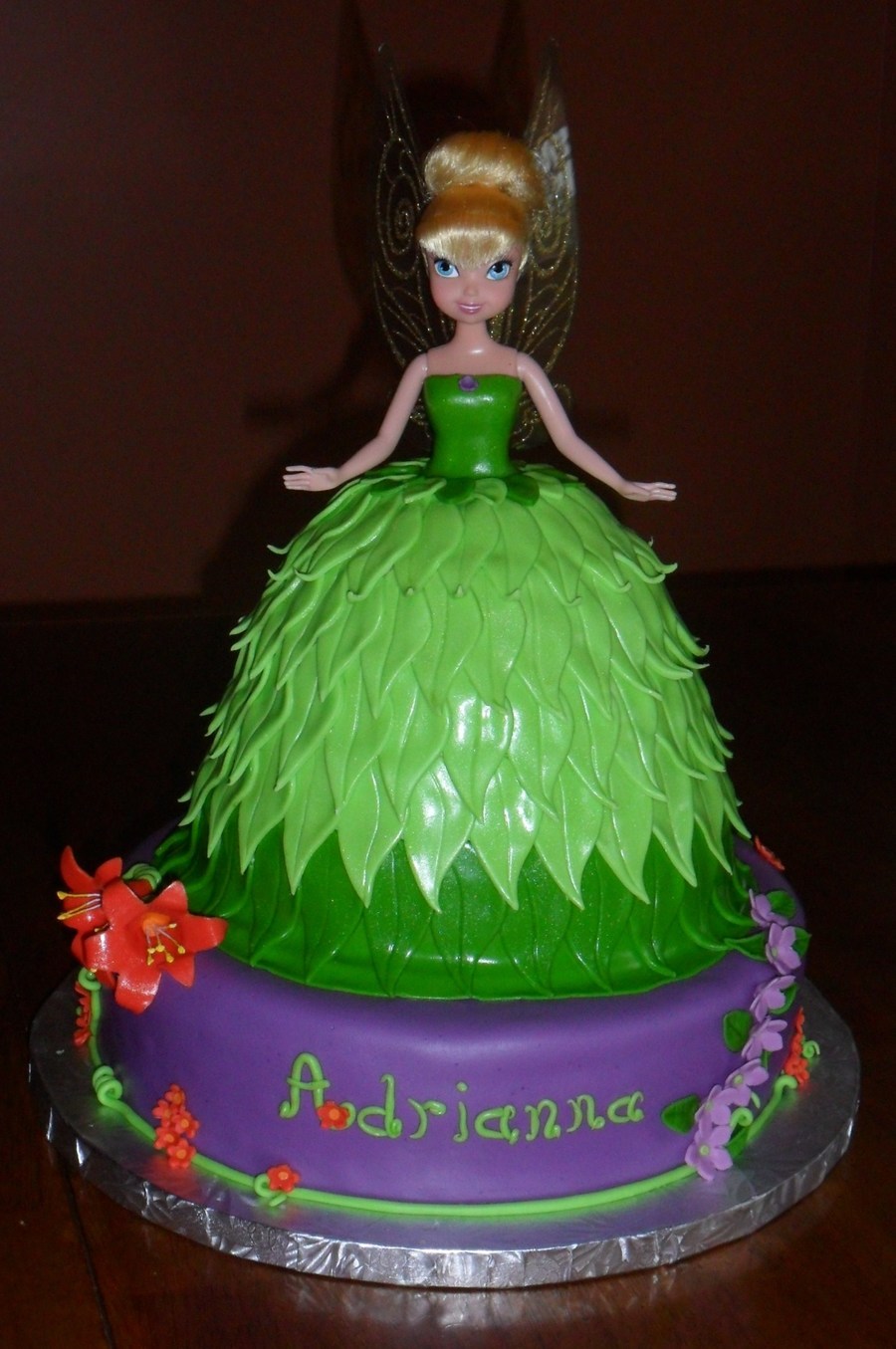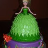 Tinkerbell doll w/ carved cake skirt - Vanilla Cake w/ Peanut Butter Buttercream covered in MMF leaves. Base cake is Chocolate Cake w/ Cookies-n-cream Buttercream covered in MMF. The flowers are gumpaste. Loved making her! TFL!