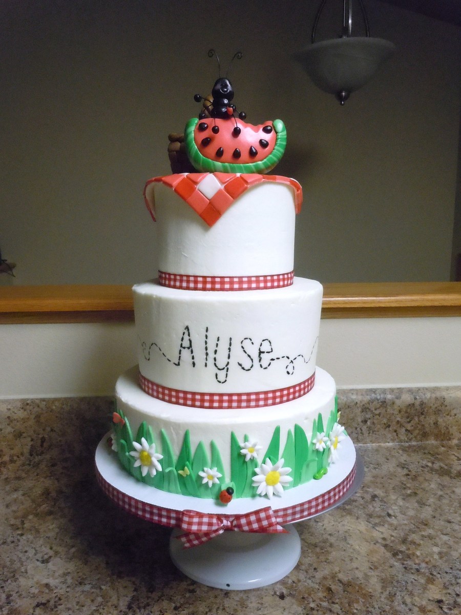 Perfect Picnic birthday cake. 10 inch death by chocolate bottom layer decorated with fondant blades of grass, daisies, lady bugs, butterflies and worm. 8 inch "watermelon" cake, 2 inch layer of vanilla chocolate chip cake dyed pink sandwiched between two 1 inch layers of vanilla cake died green... very cute! Iced in vanilla butter cream with a gingham ribbon and the birthday girls name. 6 inch layer of spring fling with a gingham ribbon and topped with a fondant picnic blanket, a fondant and rice krispie treat basket and watermelon wedge and a fondant ant.
