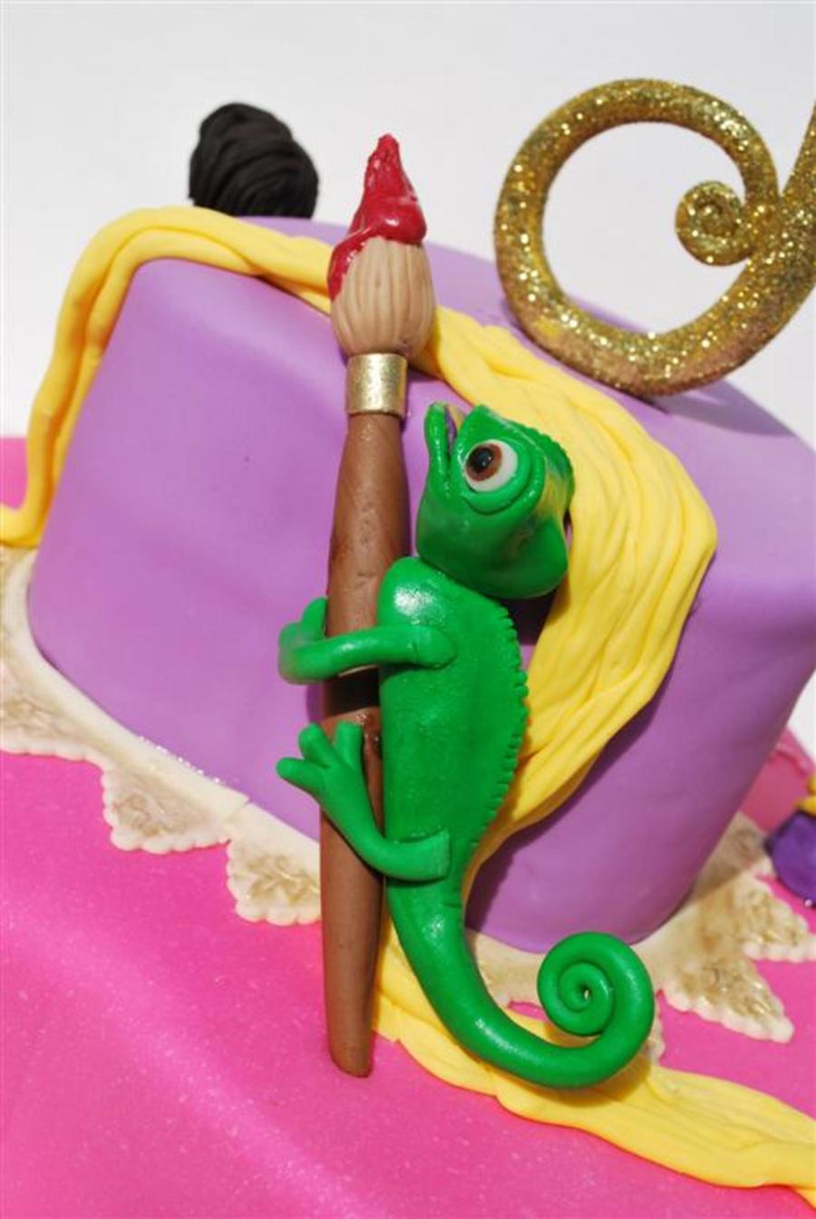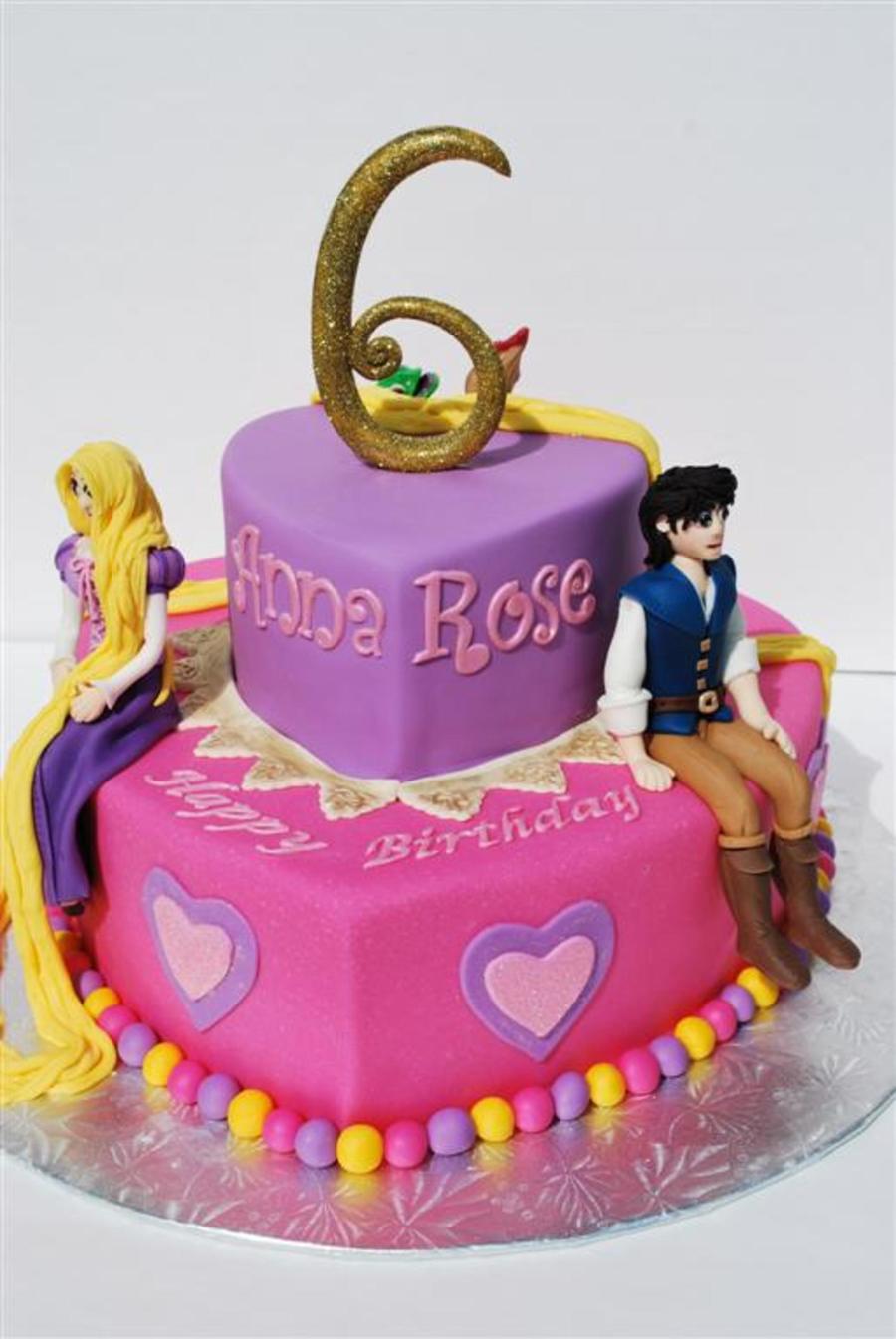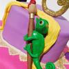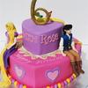 Two heart shaped cakes with Tangled characters made of fondant. "6" is covered in gold disco dust.