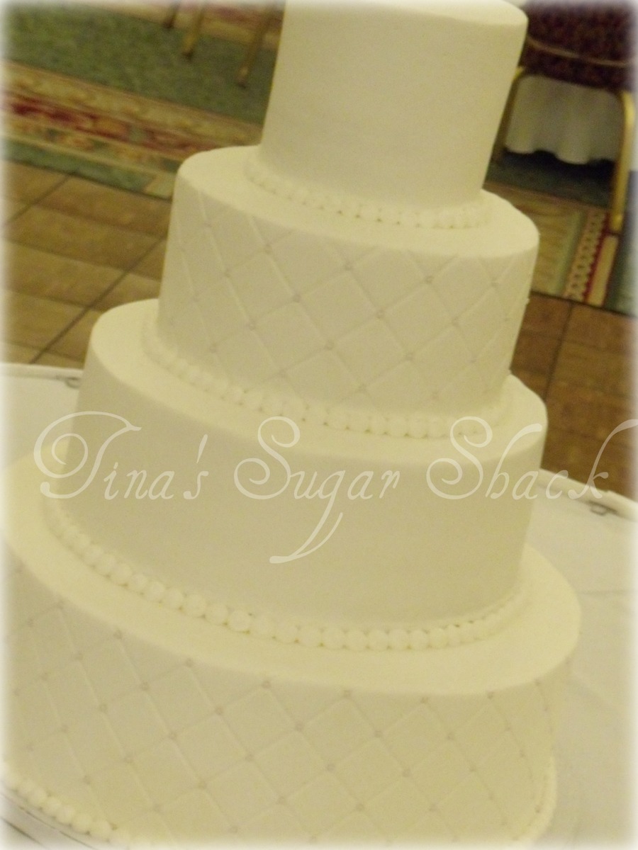 5", 8", 11", 14", round cakes all bc with diamond impression and pearls on tiers 2 and 4! I didn't get a photo after the flowers were added, so I will add that when I get one from the bride. TFL
