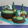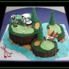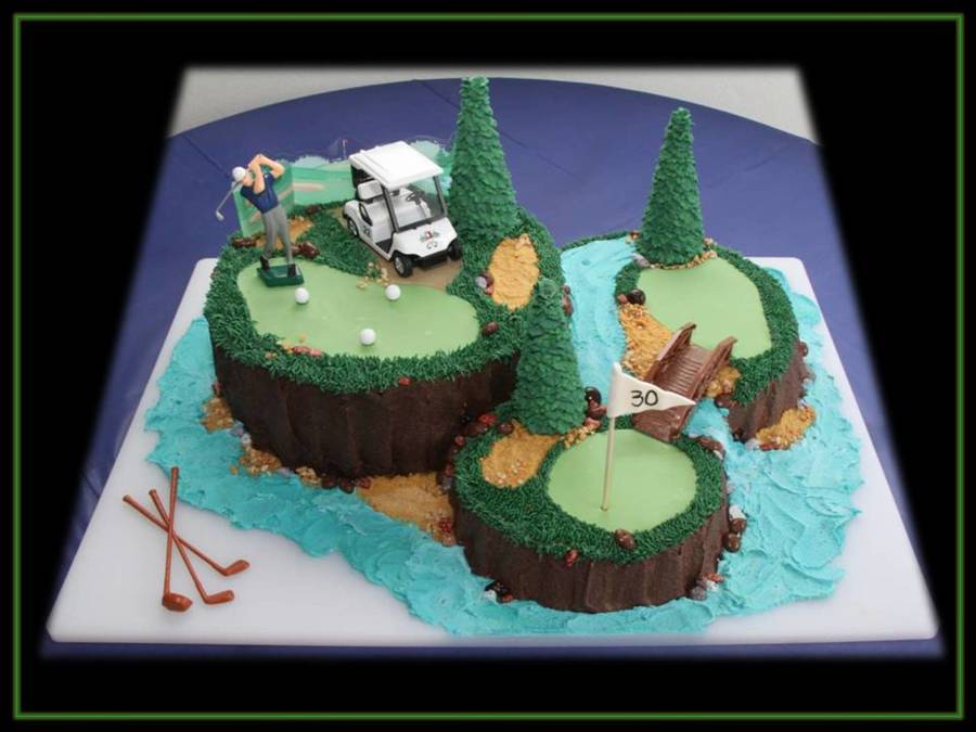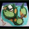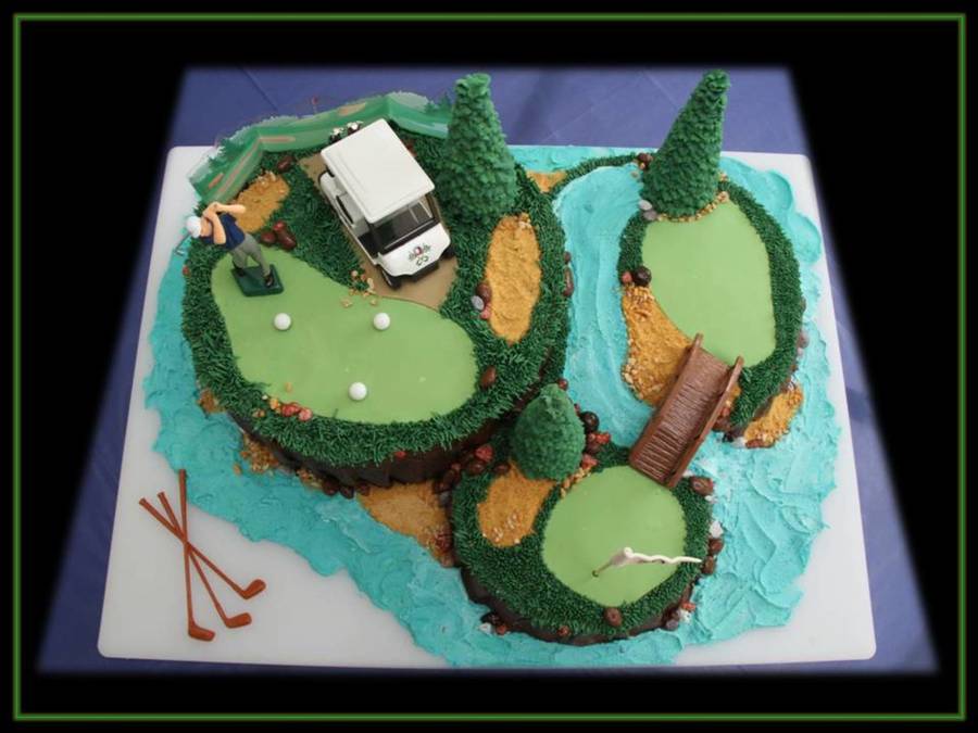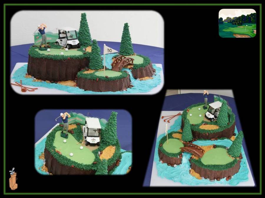 For my hubby's 30th Birthday, Golf Course on the edge of cliffs, took inspiration from the Kapalua, Maui golf course at the resort we stayed at on our honeymoon. Two of his favorites, golf and Hawaii! Tall cake is 11" black forest, lowers cakes are 6" and 8" cappuccino, all buttercream with fondant and candy rock accents. Trees are royal icing covered ice cream cones, golfer, cart and bridge are cake toppers. This was one was really fun!