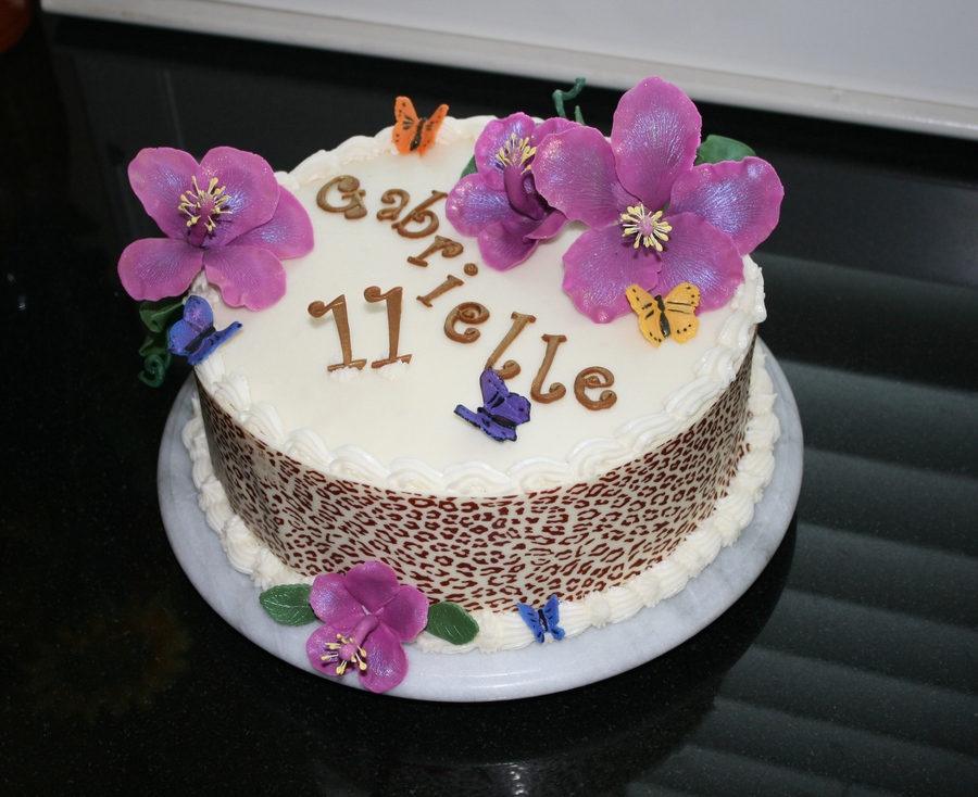Martha Stewart red velvet cake recipe, cheesecake filling, WBH cream cheese bc. Leopard transfer sheet, sugarpaste hibiscus and butterflies. For my 11 yr old's birthday. She picked the electric purple hibiscus!