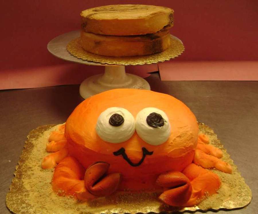 Two layer cake, beveled, iced in buttercream. Legs piped on with buttercream...pinchers, fortune cookies airbrushed orange. Sand, graham cracker crumbs. This is a, super quick to make, just for fun and eating cake. Decorating time: 10 min.