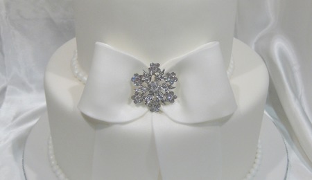 Bride wanted me to replicate a Pink cake box cake. 4 tier ivory fondant with bling band, fondant bows and bling broaches. Entire cake was sprayed with pearl sheen. Thanks for looking =)