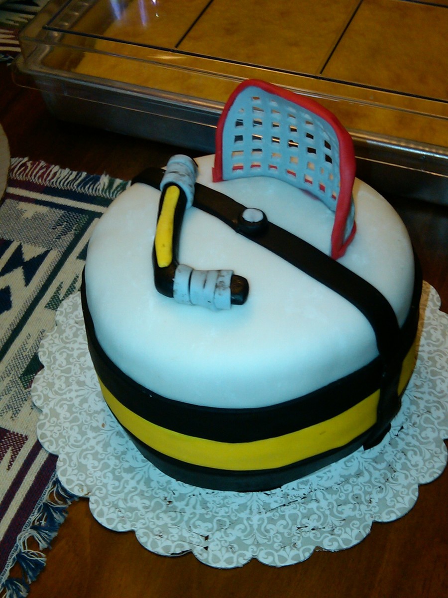 I made this cake for my brother who plays hockey, coaches hockey and loves the Penguins. I only had about an hour so it is pretty simple but he liked it and it tasted good :) Everything is MMF except the net, I used Wilton for that so it would harden up.