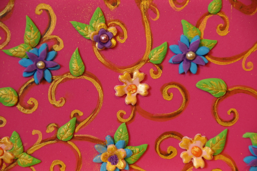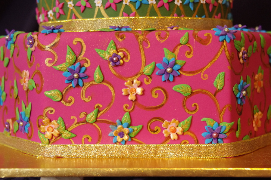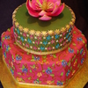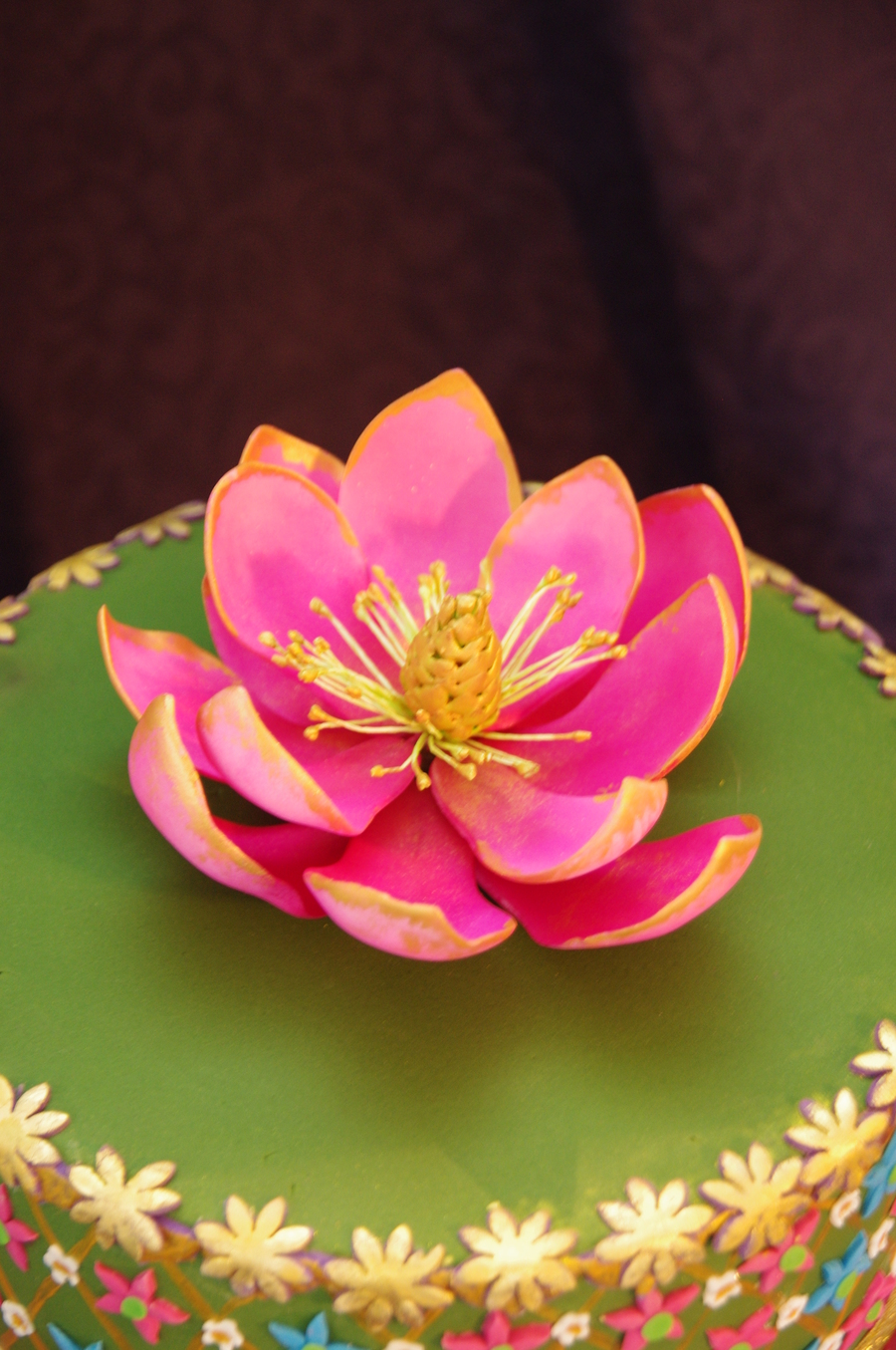 Handpainted, gold-leaf accented two tier mud cake (raspberry/white chocolate swirl, and dark chocolate) with a fantasy-coloured magnolia gumpaste flower, for a very artistic 50 year old. This sort of cake design is my passion, and I had such a great time making it. The inspiration came from some Japanese printed paper, with very "organic" lines. Thanks for looking.