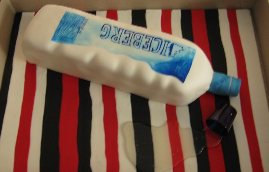 This is a two layer pecan praline cake with pecan cream cheese filling. the shot glass is made of sugar as well as the poured sugar vodka spill.