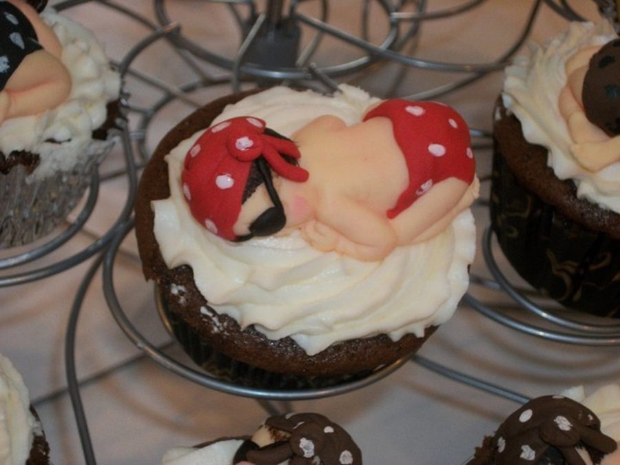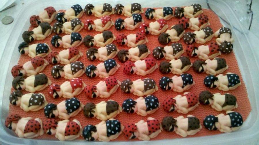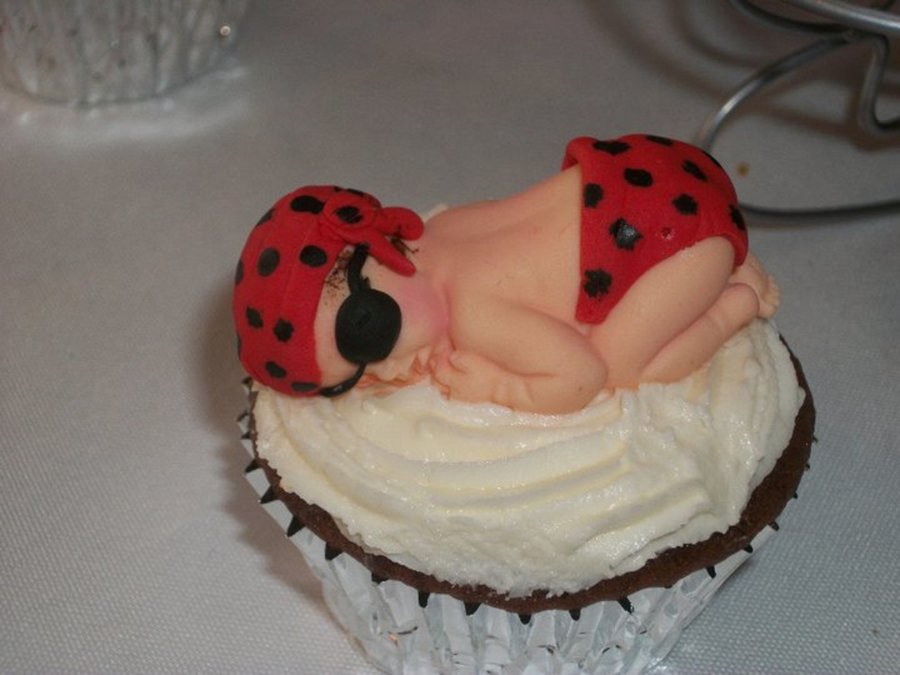 I was supose to make a pirate treasure chest for a good friends daughter's baby shower, but I had a family emergency and had to break the news that I would not be able to make her cake before I left. Her cake was do on Sunday, but I needed to leave very early morning the Friday prior. Not wanting to dissappoint her or her daughter, I offered to make filled cupcakes instead and to make them extra special I'd make special toppers to go on them. Well, these are the toppers I came up with. The color scheme for her pirate themed baby shower was red, black, white and brown. I mixed and matched the colors of their outfit's with different colored dots. I made a total of 48 baby pirate's. 24 cupcakes were chocolate filled w/vanilla bavarian cream and 24 cupcakes were vanilla filled w/chocolate bavarian cream. Each cupcake was topped with vanilla buttercream & a pirate baby. I was so happy they absolutely loved them.