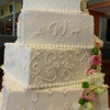 Iced in B/C, this 5 tier Square Offset cake had fondant and gum paste accents. Each tier was decorated with a different design and the initials matched the font from the wedding invitations.