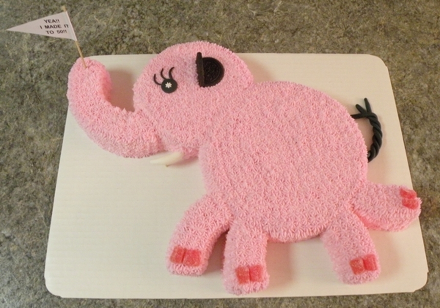 Customer's son was turning 50 and she wanted a cake just like the one that she made him for his 1st birthday....a pink elephant cake. White cake was two 8" rounds. The head, legs and trunk were cut from one of the rounds. The ear was a cookie, the tail, eye and tusk were fondant and toe nails were gum drops. The first cake made years ago had a peanut in the elephant's trunk, this time the mother wanted a flag that said "Yea!! I made it to 50!!" Fun cake to make.