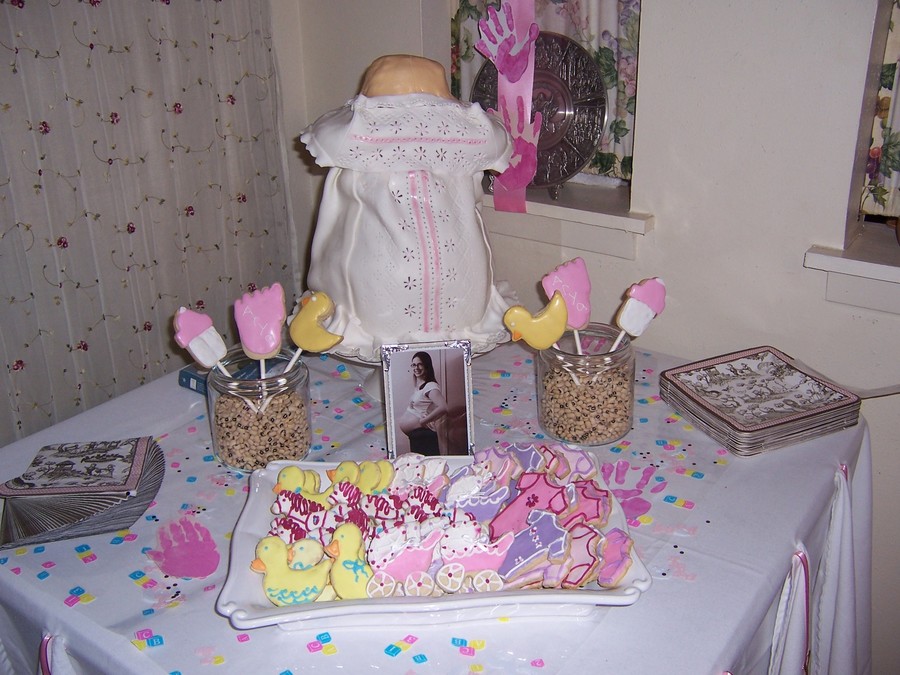 A baby shower I threw for my sister in law. Cookies are sour cream cookies with Royal icins. the cake is Three 8"rounds topped with wiltons dress pan. The tourso is rc. Covered with fondant. My first time doing somthing like this. I learned a lot next time will be a little better i hope. I had a lot of fun. Thanks for looking