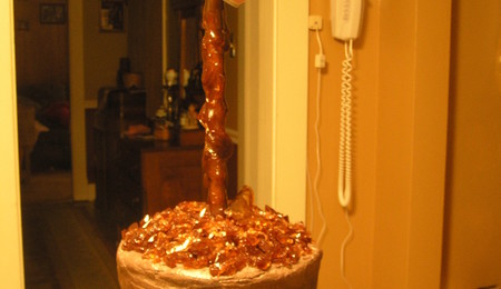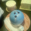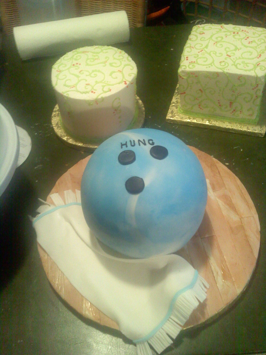Groom's cake. I needed a bowling ball bigger then the wilton ball pan. Its made with 2 soccer ball halves (which gives you a flying saucer shape) I had to trim to get a ball. The base is fondant mixed and cut to resemble hardwood floor at a bowling alley. Groom's name was Hung. fondant covered choc. cake ganache filling