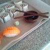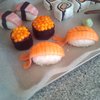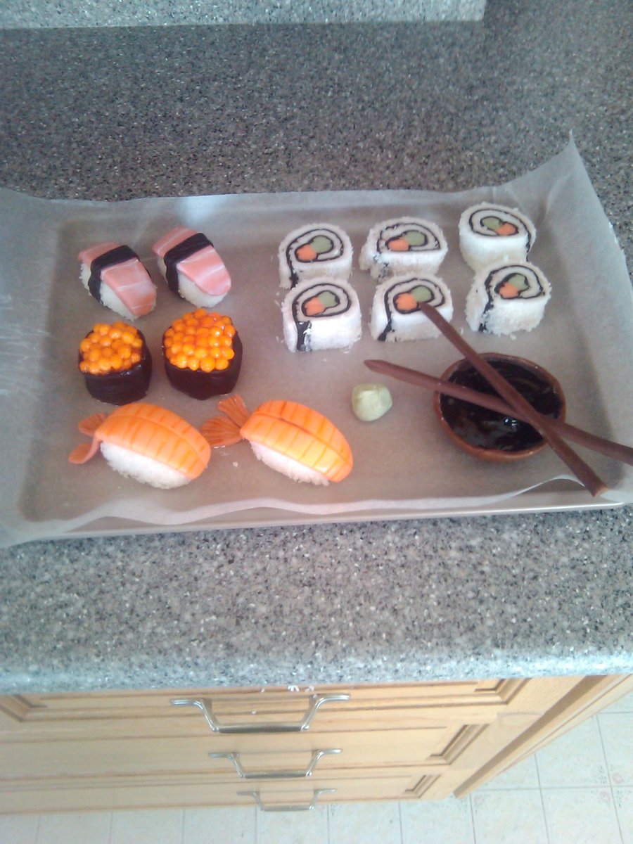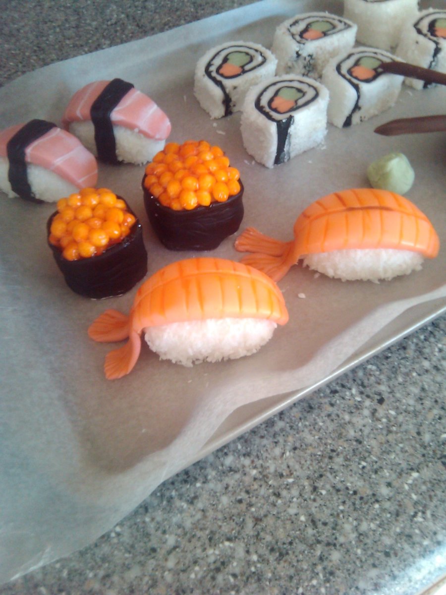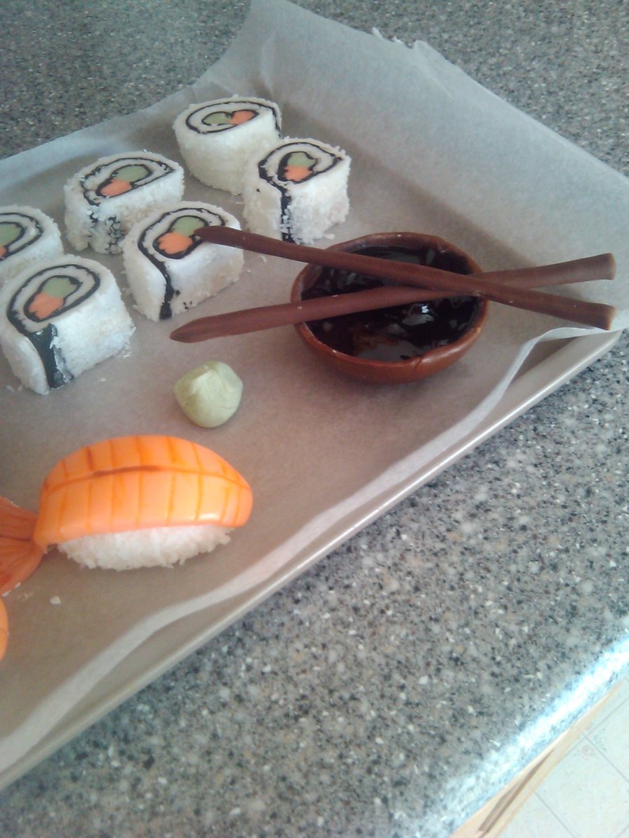 My friend made a sushi boat and asked me to make the sushi to go on top. Everything made of fondant. I rolled in in coconut for the rice look. "Soy sauce" is piping gel.