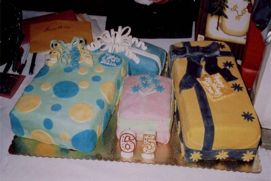 I wanted to do something a little different for my friends' mothers' 65th birthday party - something I've never seen before. So, using Marshmallow Fondant over the Too Much Chocolate Cake (which everyone just loves, and was requested by my friend), and each with a different filling, I decided to "wrap" the cakes as gifts. They were placed on the gift table with all the other presents as part of the presentation. They were a big hit!