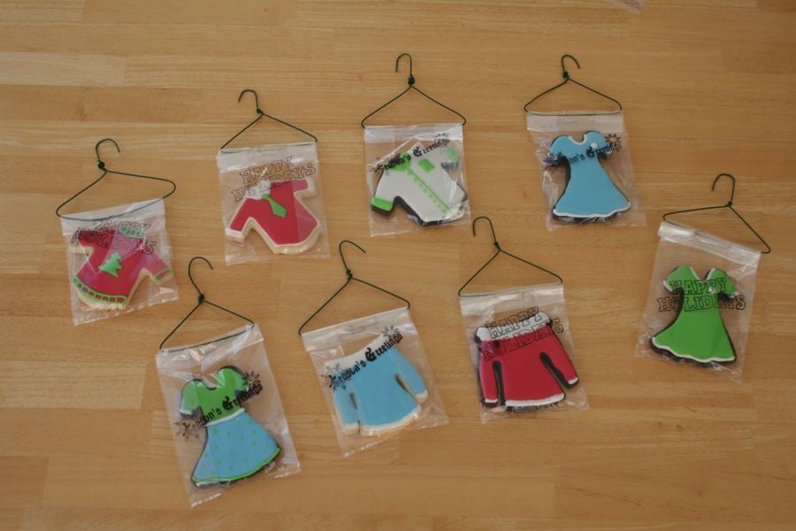 My father is in the Dry Cleaning business. This year for Christmas I made him clothes cookies in sugar, chocolate, and gingerbread. They decorated the tree in the store with these cookies ornaments (edible) on wire hangers. Then I made him another 150 additional decorated clothes cookies to give away to the customers' children. Some were red/green and Christmassy and some were non-Christmas colors for the families who didn't celebrate Christmas.
