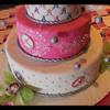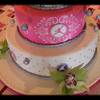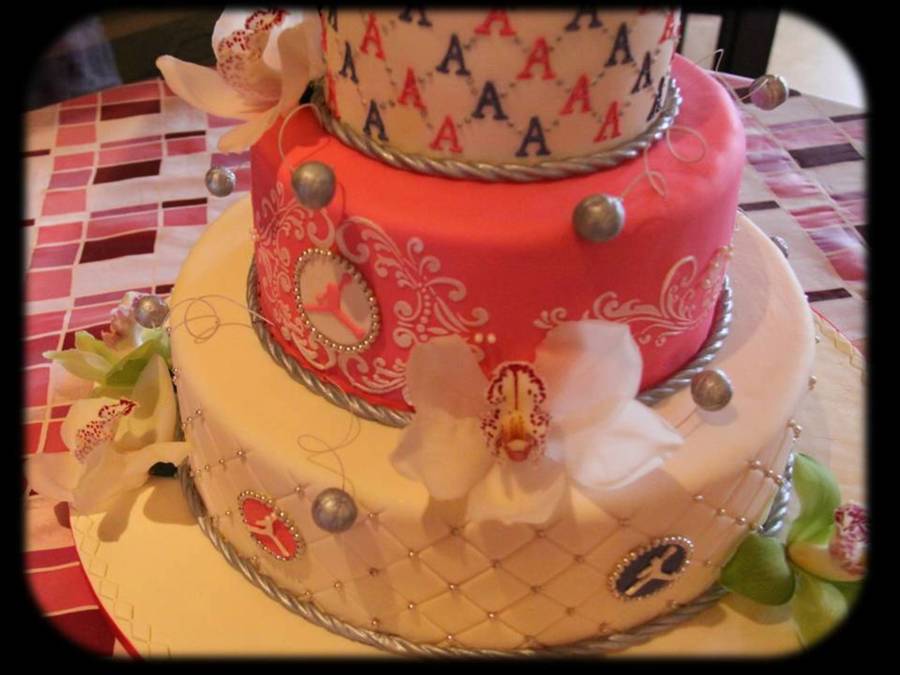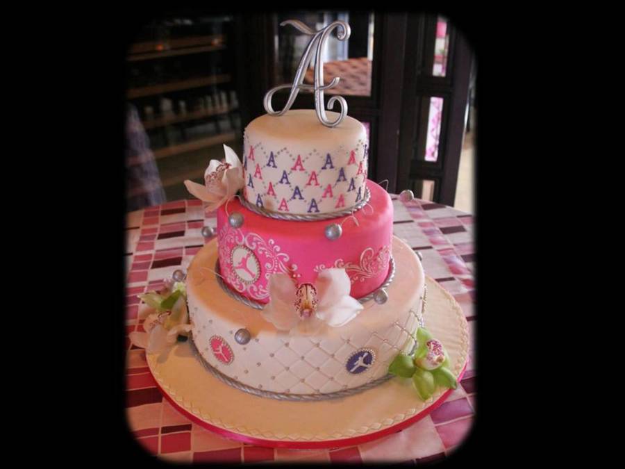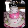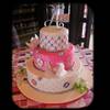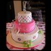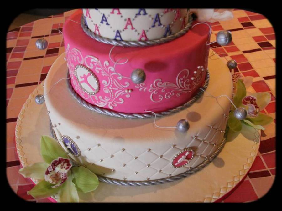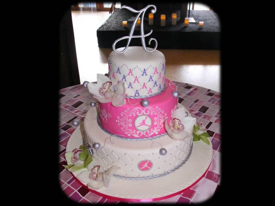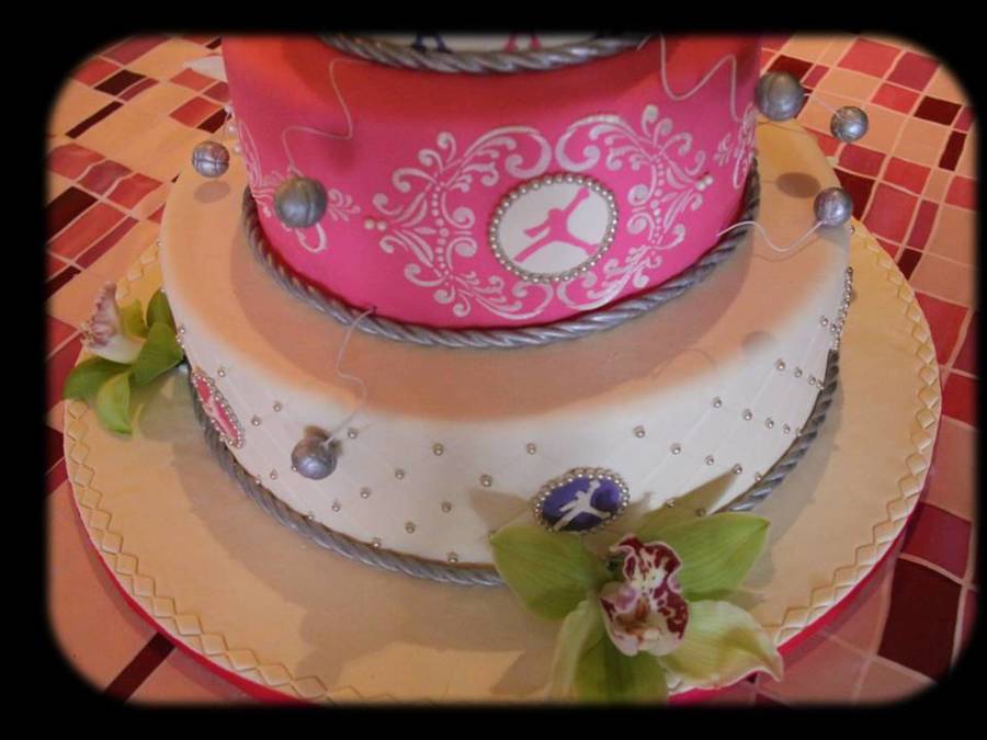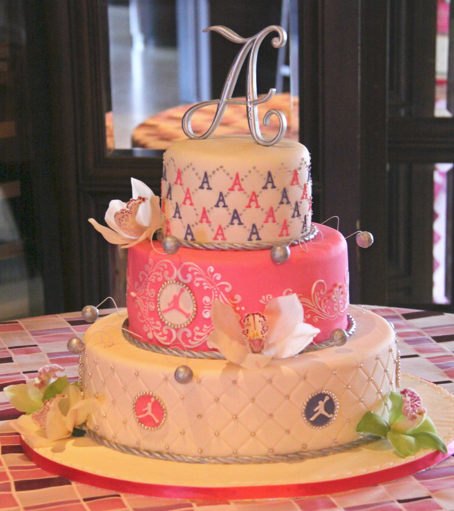 This was one was a lot of fun! The bride gave me a picture from PCB that she wanted something similar of, they both love basketball and wanted an elegant way to incorporate that with the Jordan cameos and then we thought that the 'bouncing' mini silver basketballs coming down the cake would be fun mixed in with the flowers. All fondant covered, hand carved Jordan cameos, royal icing piping and stenciling, fondant silver rope. :) Her colors were gorgeous, the reception was beautiful with bright pink, purple and green. TFL :)