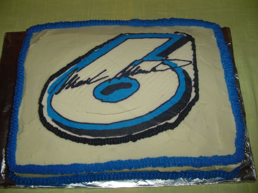 White 1/2 sheet cake. Buttercream transfer. Done for my husband's birthday. Mark is his favorite driver.