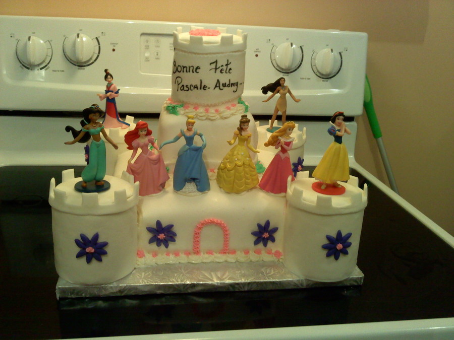 Bottom and top tiers are cakes, towers are plastic containers, figurines are plastic. All covered in fondant and accents are buttercream.