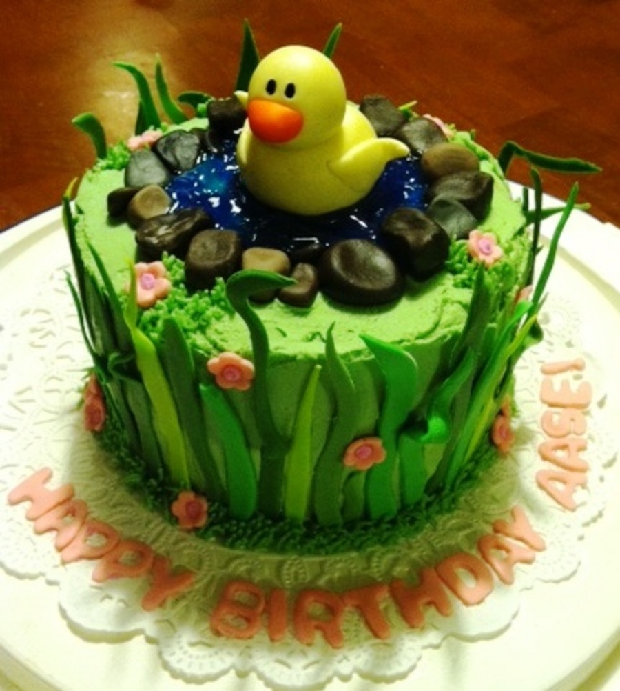 fondant duck, rocks, grass, letters, & flowers. Pineapple coconut: cake, buttercream, & filling. Colored piping gel for water.