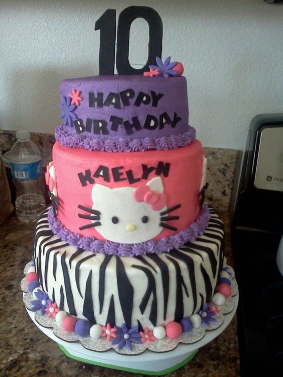 I made this for my niece, she loves Hello Kitty. The bottom was a 10 inch wasc cake, the middle was an8 inch pink champagne cake and the top was a inch chocolate cake all in buttercream. All the decorations were done with fondant. She loved it!!!