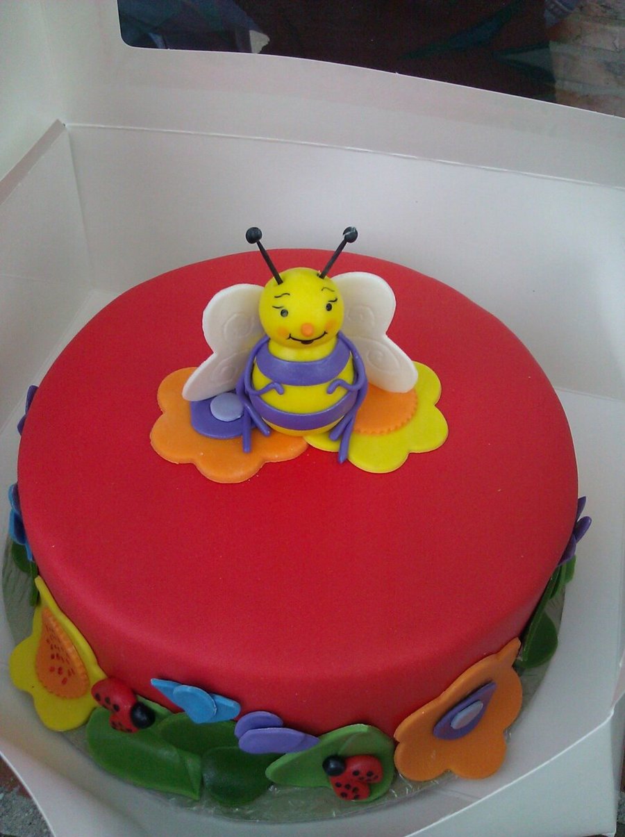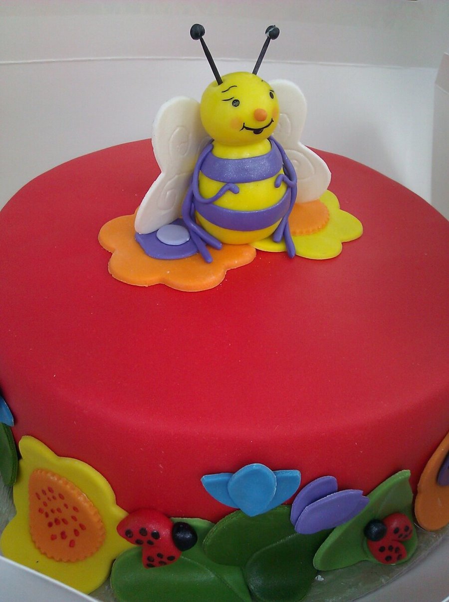 My friends daughter wanted a RED cake with a bee and a lady bug on it. This is what we came up with based on her favorite bedtime storybook. All done in MMF, the wings are gumpaste and the antenne are toothpicks. You can't see it, but the wings and some flowers have pearl dust on them.