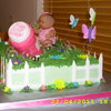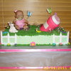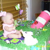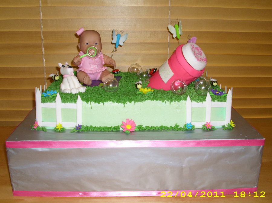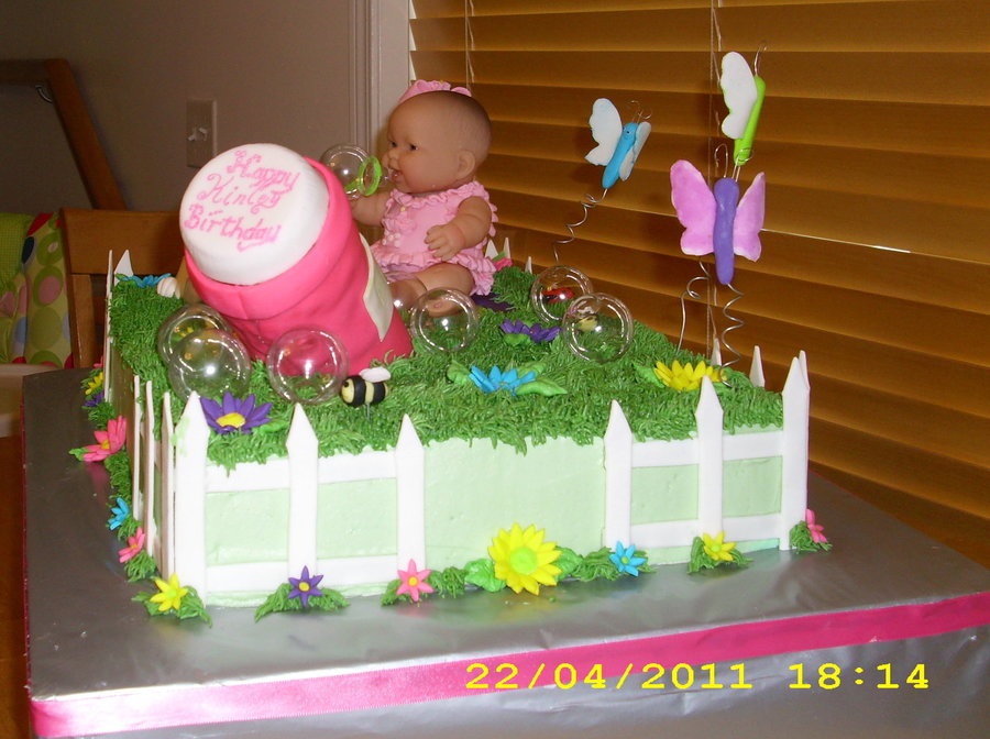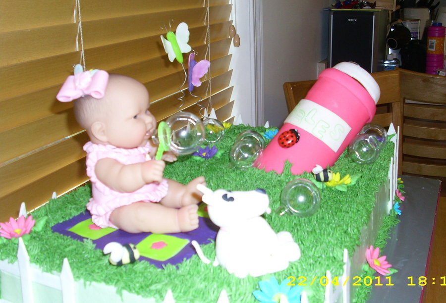 This cake was made for a friends daughter who turned one. The bottle of bubbles actually blew bubbles. The bubbles blew up and away from the cake they were also non toxic just incase. All the accents were made from fondant the clear bubbles were shatterproof balls from a string of lights. The baby was a doll I found that looks like the birthday girl. Her outfit is made of fondant to look like the one she was wearing for her party. The whole family was amazed and loved the cake so I was happy. Over all I was very pleased with the outcome of this cake.