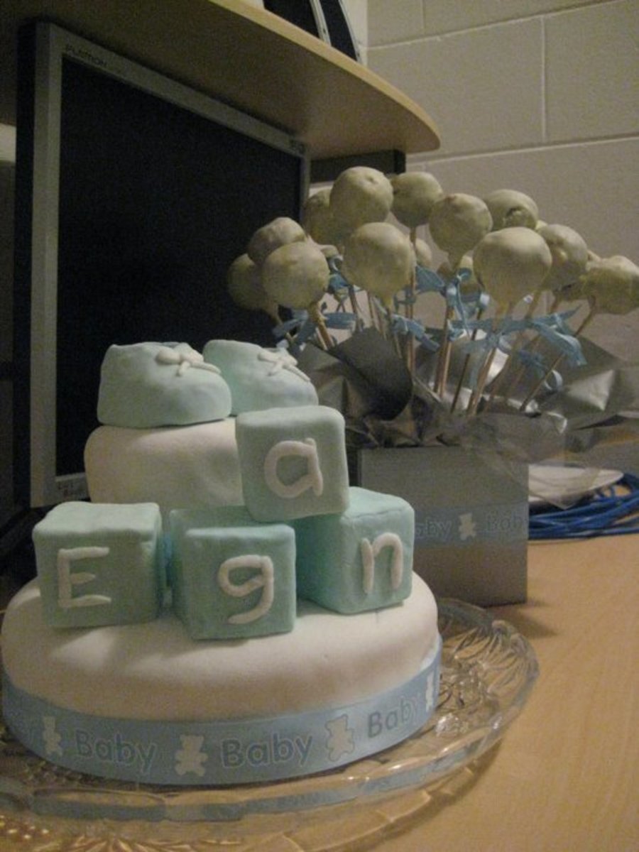 The Cake i made for my Godson's Christening that we travelled to Australia for. It was very hot/humid in Cairns and the cake had to be kept in the Airconditioning! Vanilla Cake with Chocolate cream topped with Fondant. Chocolate and Vanilla Cake Balls coated in White Chocolate. The Blocks are foam covered with Fondant and GumTex and the shoes were covered in the same mix but were little plastic Dolly shoes from the $1 store.