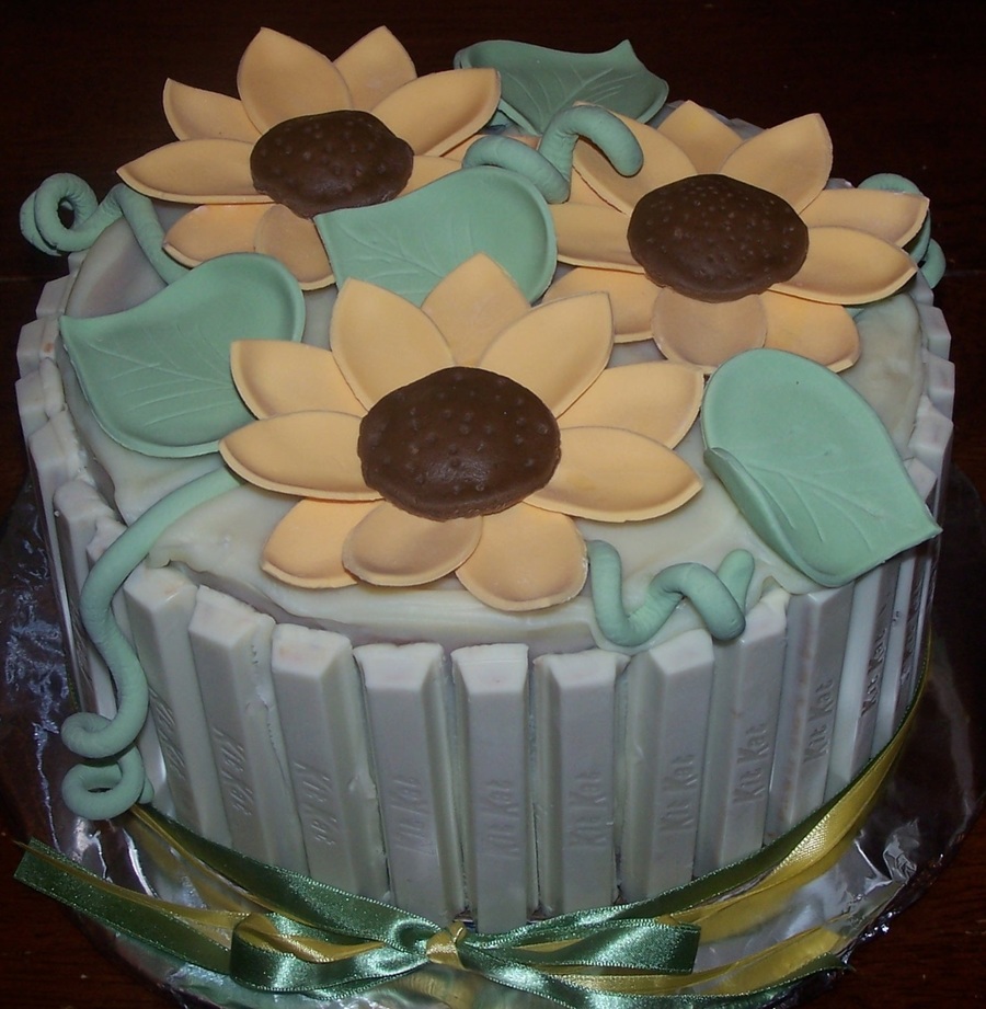 My friend asked for white chocolate cake with sunflowers. All I could think of was white chocolate KitKats.....YUM! White cake with raspberry filling, white chocolate ganache, white chocolate KitKats and gumpaste flowers.
